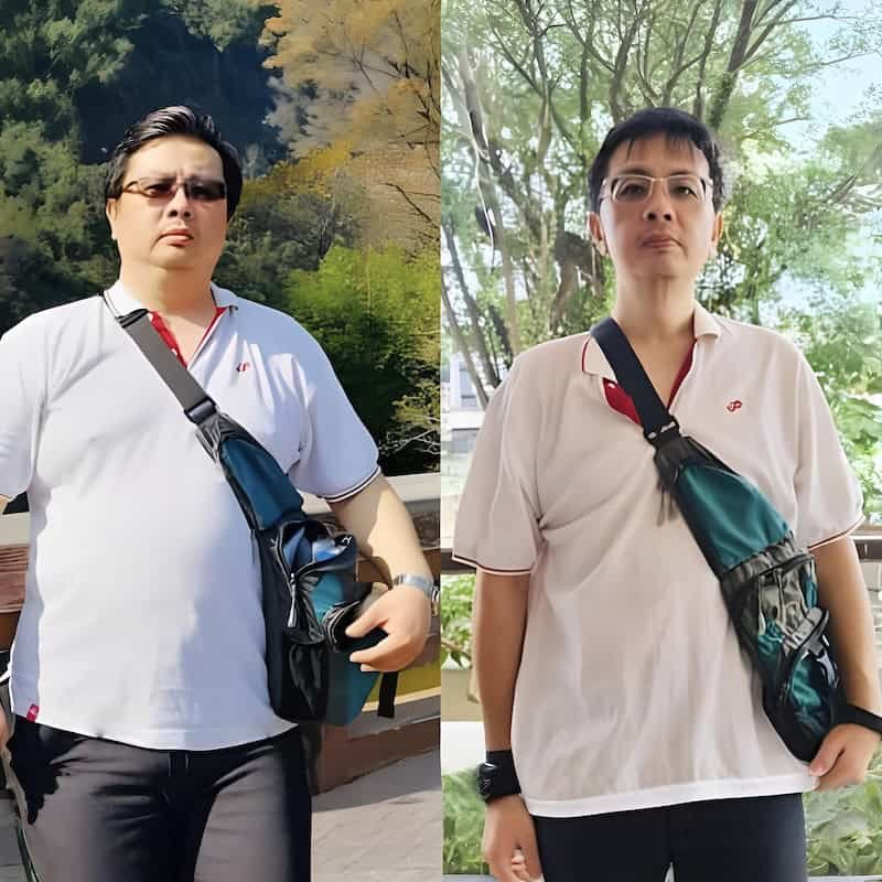 Now? Wow! I lost 22 kgs in one year! I went from a 5XL to L, even M size now. My blood sugar is normal, no longer pre-diabetic, and my BP is always around 120. A total new me, man!